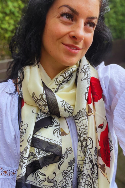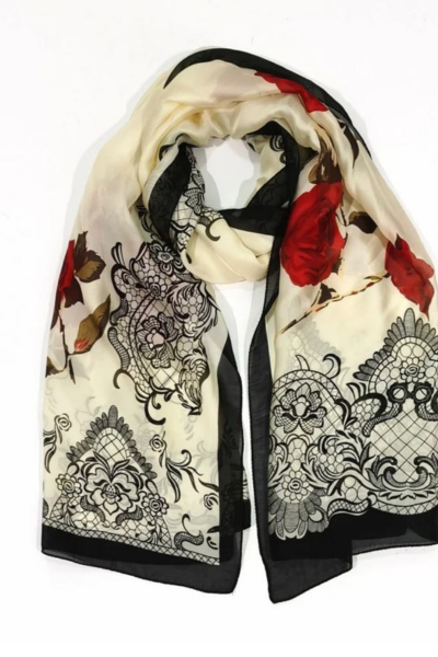 Et smuk tørklæde, der oser af elegance og let luksus. Dette smukke accessorie er fremstillet i en lækker blanding af viskose og silke, som giver en fantastisk blødhed, lethed og et naturligt glansfuldt fald.
