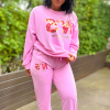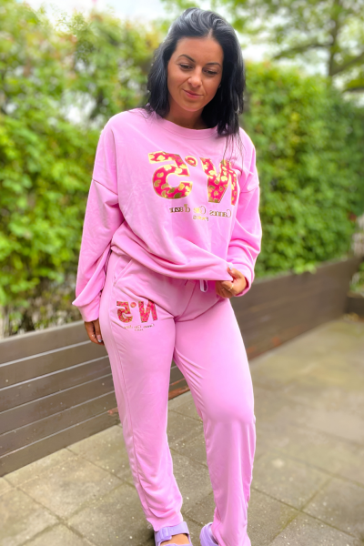 Sættet består af en blød sweatshirt og matchende bukser, begge prydet med et elegant logo-print, der giver et eksklusivt og feminint udtryk.
