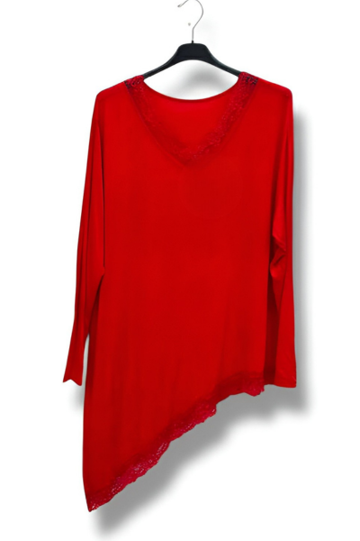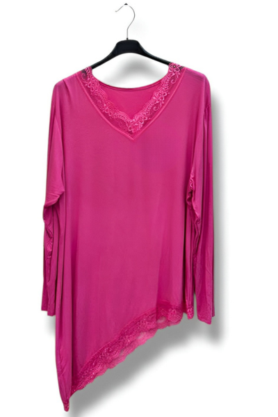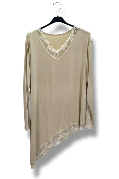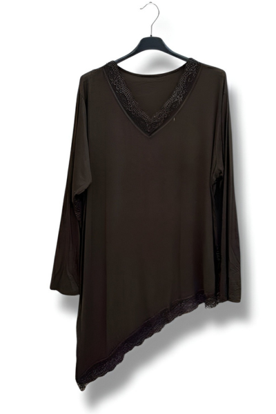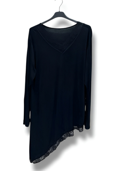 Denne skønne asymmetriske bluse med fine blondedetaljer er designet til at fremhæve din feminine side på en elegant og afslappet måde. Det asymmetriske snit giver et flot fald og et moderne udtryk, mens blonden tilfører et romantisk og eksklusivt touch.