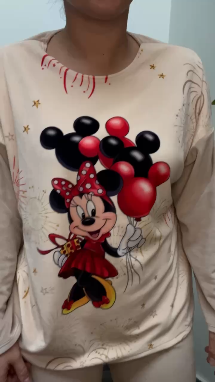 Forkæl dig selv med dette skønne velour-sæt, der kombinerer komfort, stil og legende charme. Sættet består af en langærmet bluse med rund halsudskæring og et sødt Minnie-print med balloner, som giver et feminint og sjovt twist.