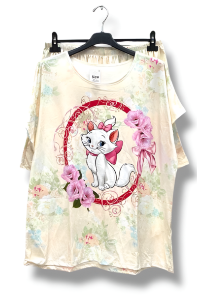 Et yndigt og behageligt shortssæt, der passer perfekt som nattøj, loungewear eller et let sommersæt. Pyntet med det elskelige Disney-kattekilling Lille Marie fra Aristocats, som – med sin velkendte charme – beundrer sig selv i spejlet midt i et blomstrende sommerunivers.