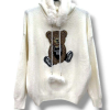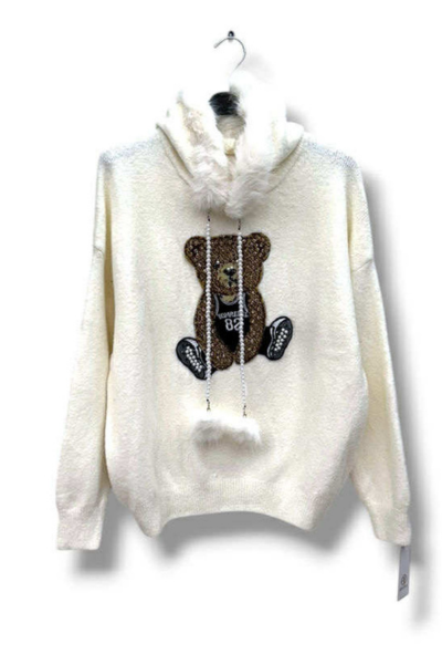 Gør dig klar til hygge med et strejf af glamour! Denne bløde strik hoodie kombinerer komfort, varme og et sødt, eksklusivt udtryk. På brystet pryder en glitrende bamse, og hætten er pyntet med lækkert fake fur – både på kanten og som pom pom-detaljer på snorene.