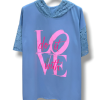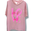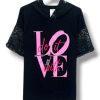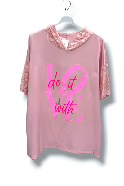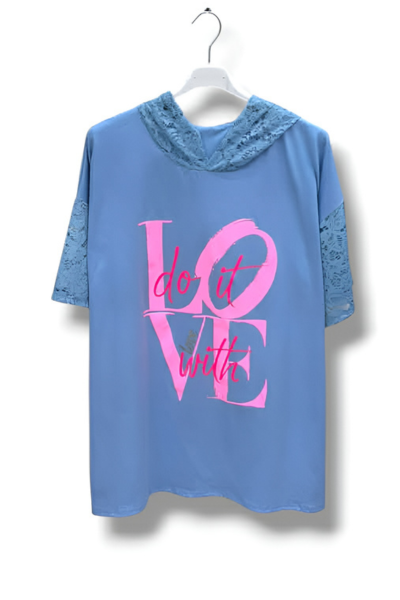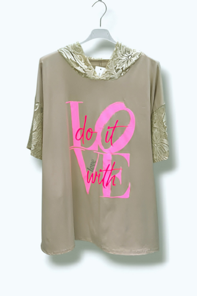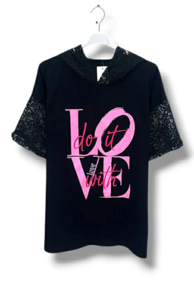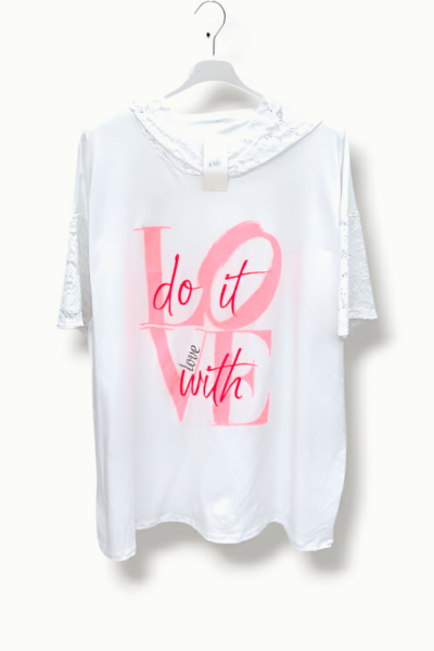 Denne hoodie T-shirt er alt andet end almindelig. Den kombinerer det sporty og afslappede med smukke blondedetaljer ved ærmer og hætte, som giver et unikt og feminint twist. Det stilfulde print foran fuldender looket og gør den perfekt til dig, der elsker at skille dig ud – på den elegante måde.