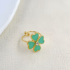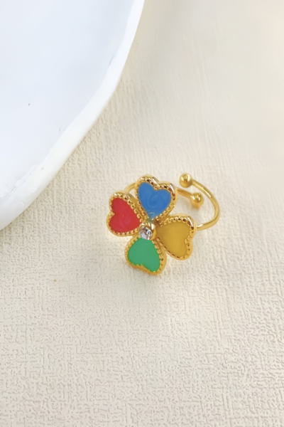 Denne skønne fingerring er formet som et elegant firkløver, hvor de fire blade er udformet som små hjerter – et smukt symbol på både kærlighed og held. I midten prydes ringen af en fin sten, som tilfører et diskret glimt og et eksklusivt udtryk.