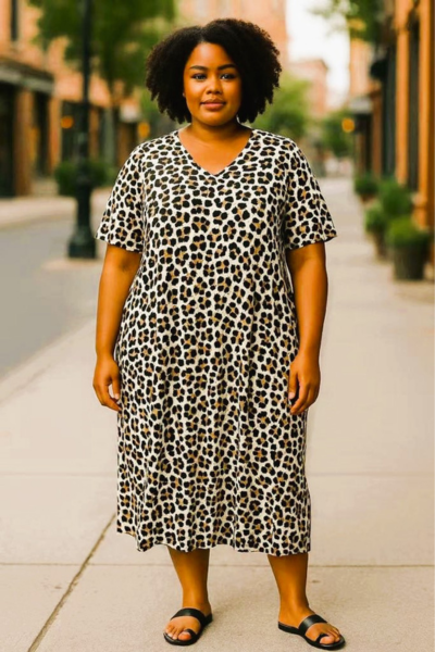 Gå efter både komfort og stil med denne lange T-shirt kjole i trendy leopardprint! Den har en flot, dyb V-udskæring , der fremhæver halsudskæringen på elegant vis, og det afslappede snit giver en cool og moderne silhuet derudover er der et fint lille slids i hver side af kjolen.