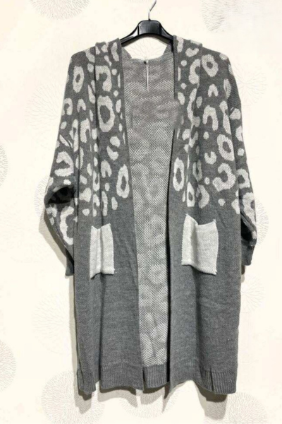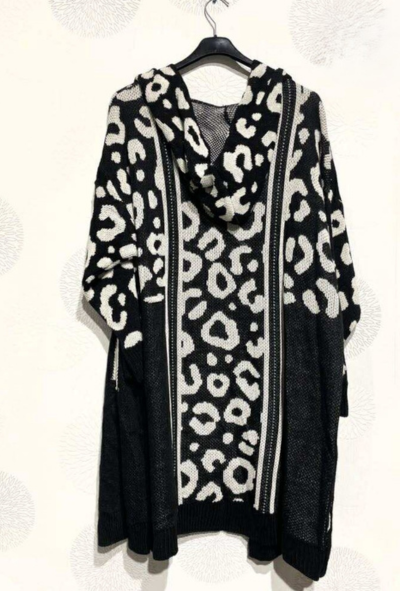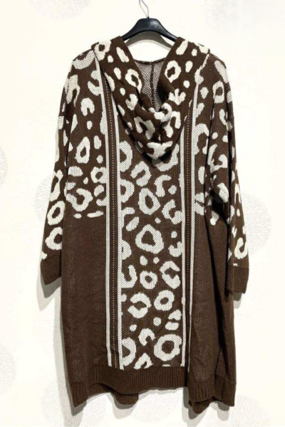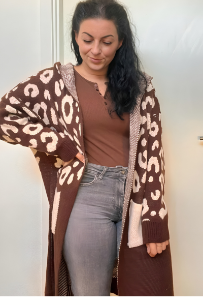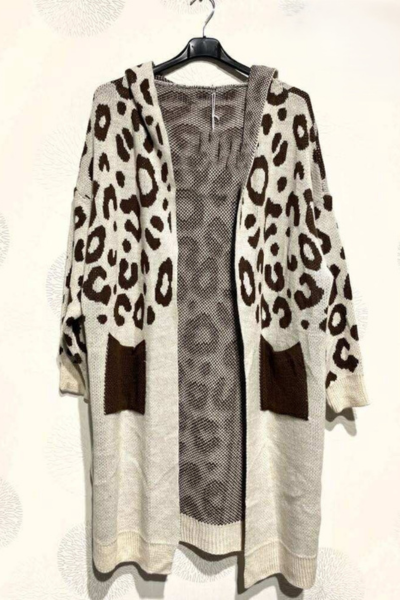 Giv din garderobe et ekstra pift med denne skønne strik-cardigan i trendy leopardmønster. Den er både blød, lun og superpraktisk med hætte og lommer – perfekt til de kølige dage, hvor du vil holde varmen og samtidig se stilfuld ud.