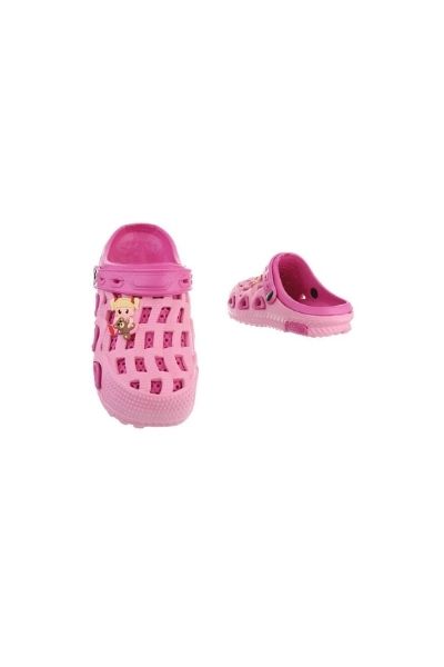 Crocs sandalen har en lille applikation som er en lille dukke som sidder med sin bamse. Ved hælen er der en rem, som kan bøjes op, så den placeres over vristen. Man kan selv pynte med flere applikationer.