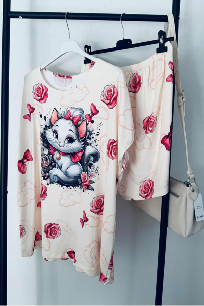 Sættet består af en kortærmet, blød bluse med et nuttet print af Marie samt matchende shorts med elastik i taljen for maksimal komfort.