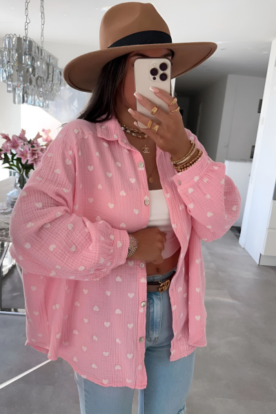 Denne rosa skjorte, vævet i det blødeste bomuldsstof, er pyntet med små hjerter – som hviskende løfter om nærhed og varme. Den omslutter dig med blid elegance og en yndefuld lethed, der får hjertet til at slå en lille smule hurtigere. Skabt til øjeblikke fyldt med ro, kærlighed og skønhed.