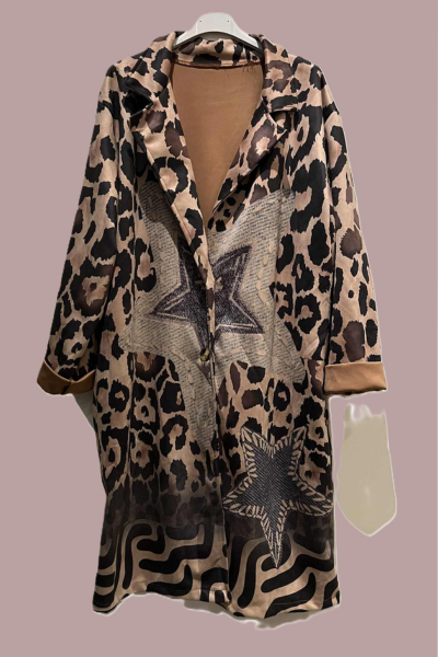 Gør dit outfit ekstra iøjnefaldende med denne smukke jakke! Den kombinerer det klassiske leopardprint med cool stjerner – en perfekt blanding af råt og feminint.