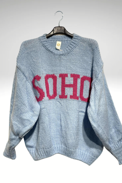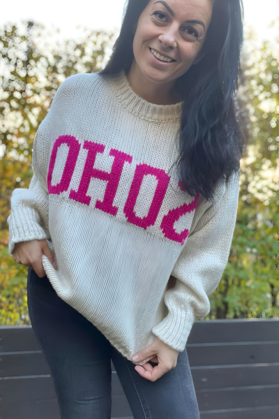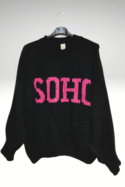 Hold varmen med stil i denne superlækre, vamset strik med det ikoniske SOHO-print. Den har et afslappet fit, chunky strik og den helt rigtige street vibe, som gør den perfekt til både jeans og leggings.