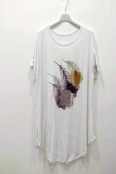 Oplev den perfekte kombination af komfort og stil med vores fantastiske viskose tunika, der er designet til at give dig et elegant og afslappet look. Tunikaen er prydet med et smukt, unikt fjerprint, der tilføjer et naturligt og let præg til dit outfit. Den bløde viskosekvalitet sikrer en behagelig pasform hele dagen, mens det luftige design giver dig frihed til at bevæge dig med elegance.
